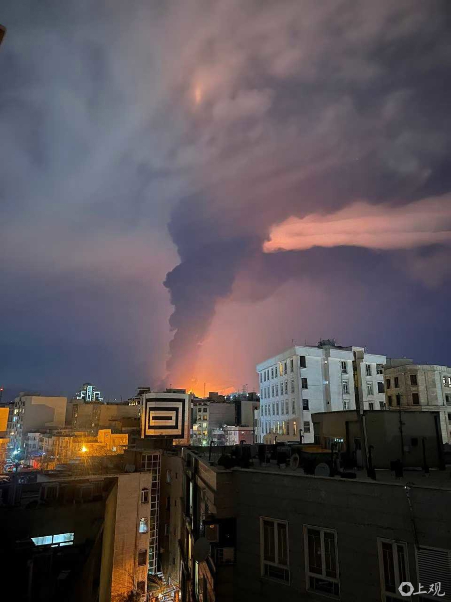 3月8日深夜,此时此刻的德黑兰,远处因为轰炸冒起的大火与浓烟直冲天际。