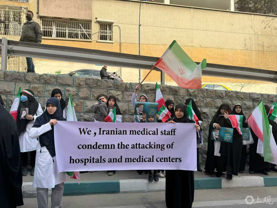 3月8日,百名医护人员在被袭击的甘地医院门口集会,抗议美以袭击医疗设施。
